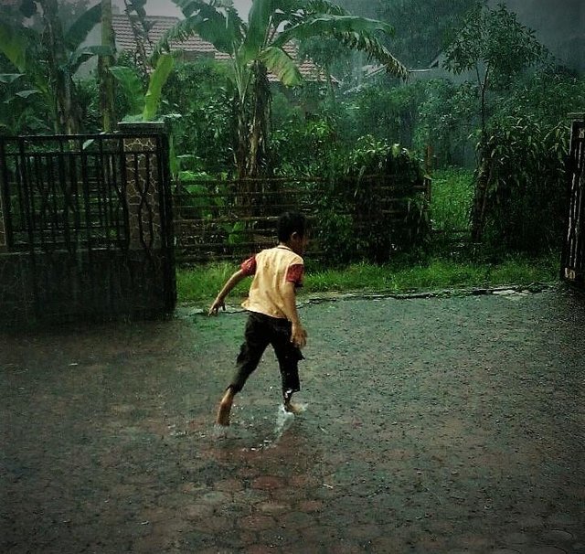 Agar kelak anak-anakku pun menjadi orang yang luar biasa, maka 2 bocah lanangku, Ezhy dan Rhey tidak pernah kularang untuk bermain-main di bawah hujan. Bahkan, sesekali aku juga akan ikut menerjunkan diri ke derasnya hujan yang sedang mengguyur bumi. Berlarian, berkejar-kejaran atau bersilat-silatan dengan mereka tak akan aku merasa jika masa kecilku kurang bahagia. Justru mandi hujan bersama mereka akan membuat kami akrab, dan dari mereka sendiri akan timbul rasa percaya diri, bahwa alam sebenarnya begitu bersahabat.